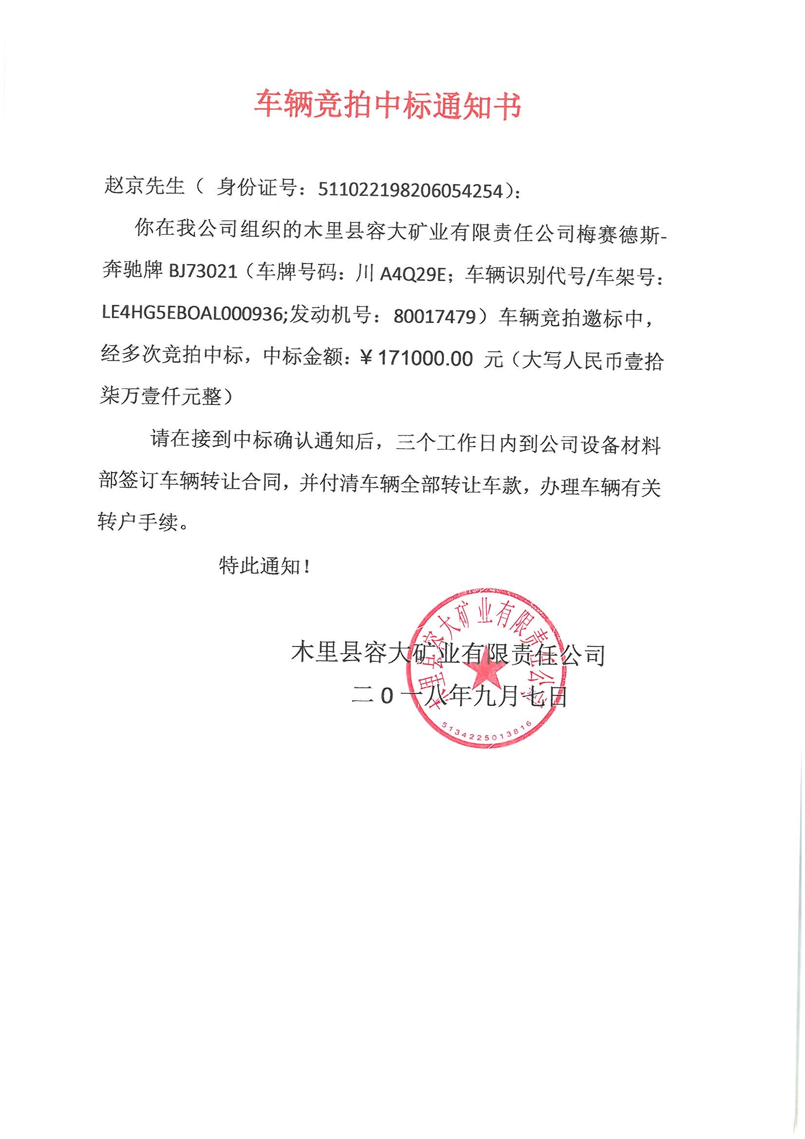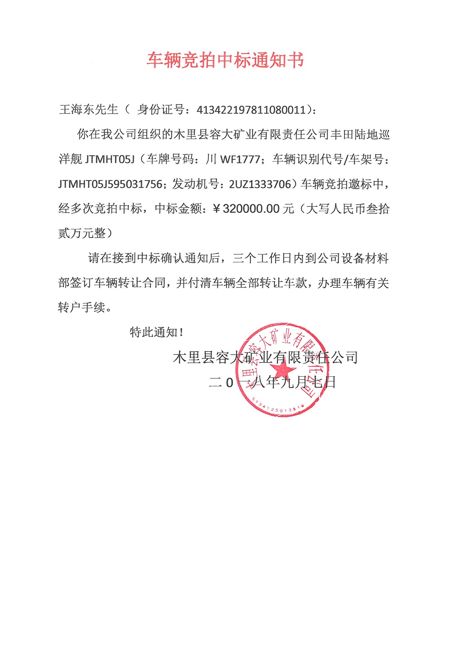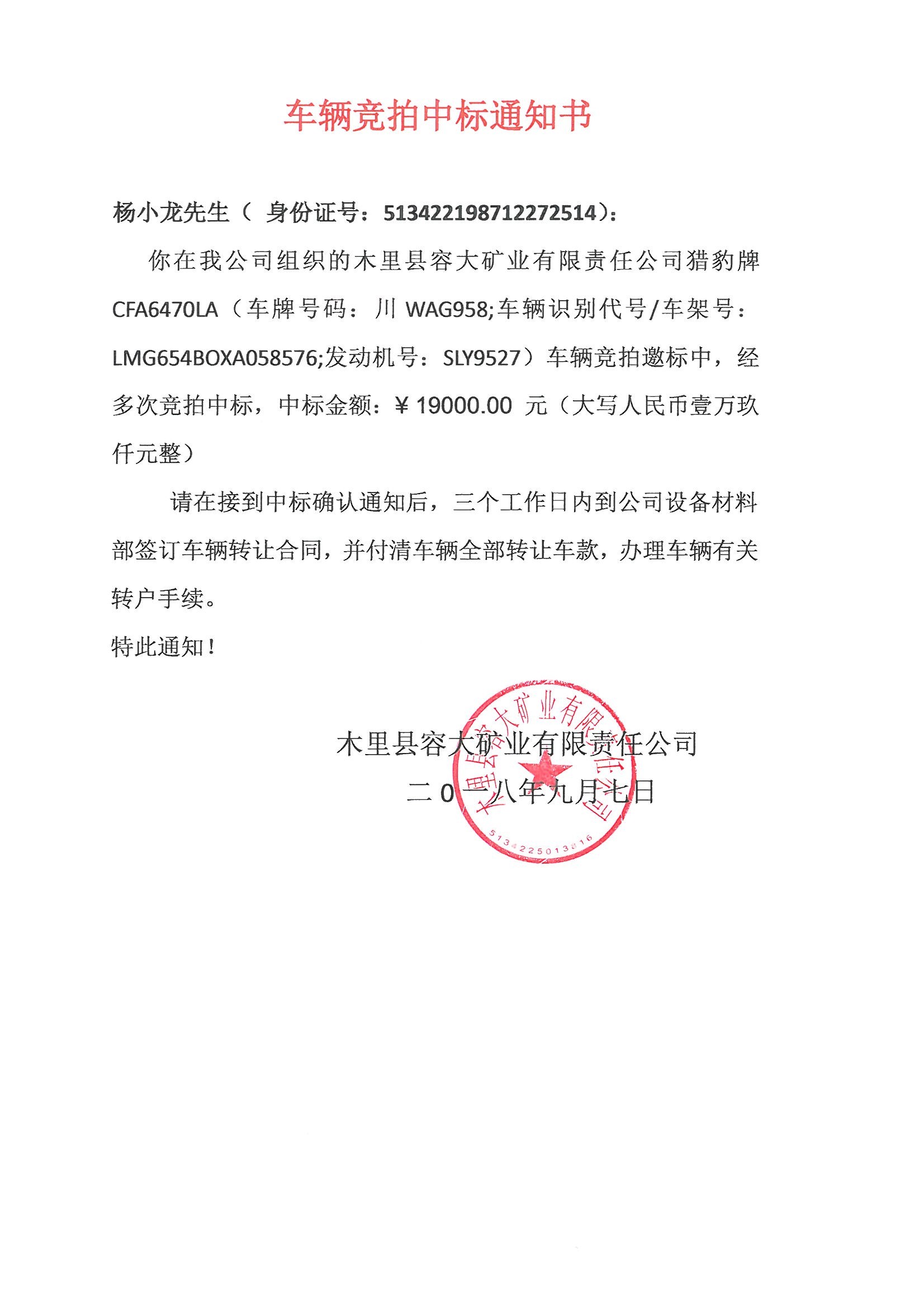 木里縣容大礦業(yè)有限責(zé)任公司車輛競拍中標通知書